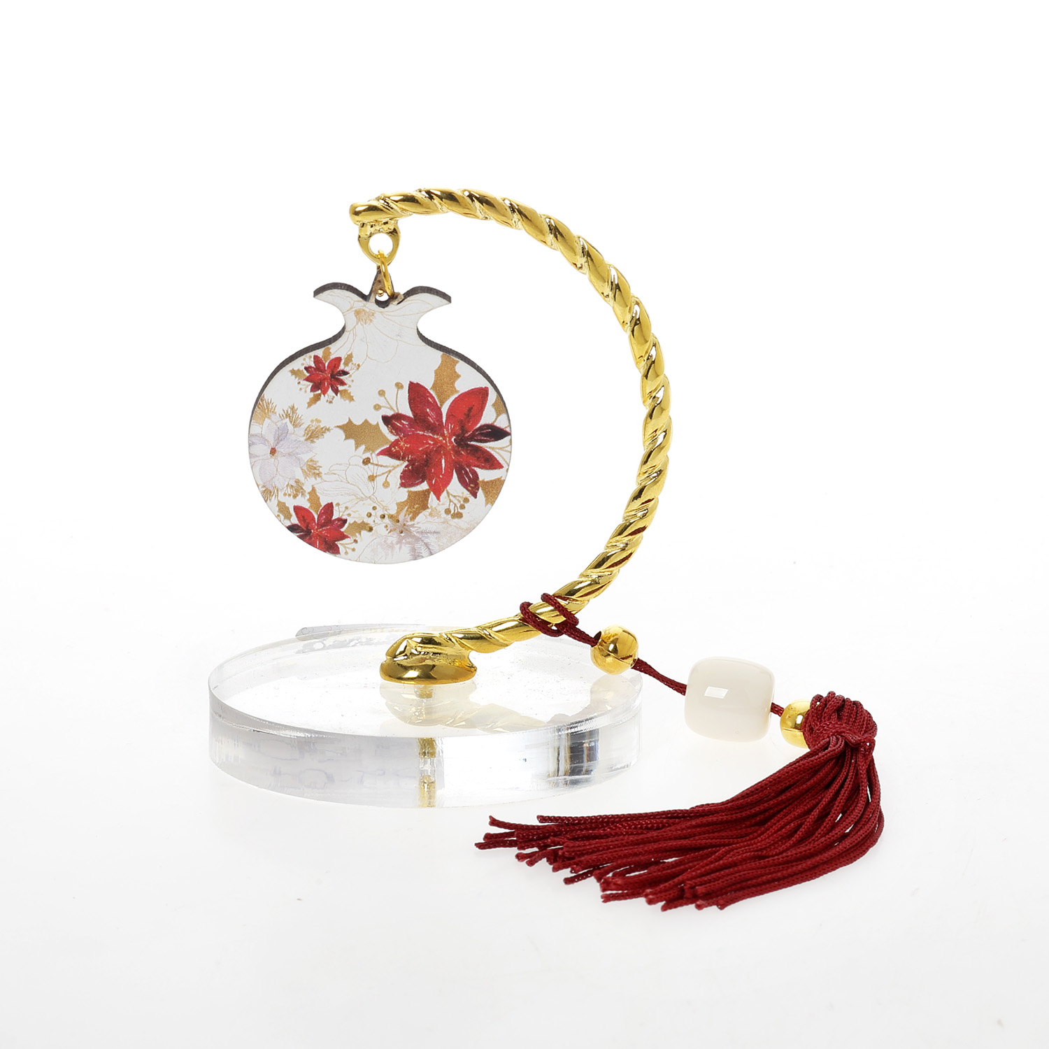 Βραχάκι οβάλ plexi ρόδι κόκκινα λευκά λουλούδια ξύλινο τυπωμένο με κόκκινη φούντα