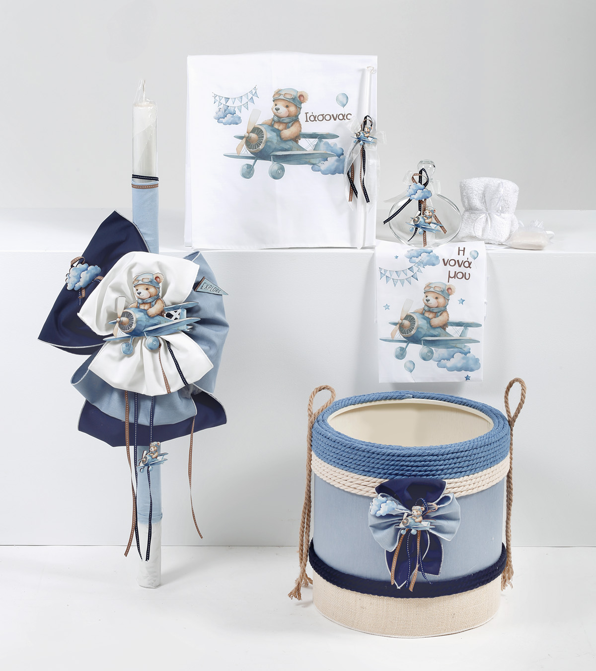 Πακέτο βάπτισης αγόρι με θέμα Αρκούδος αεροπλάνο στρογγυλό μπαούλο