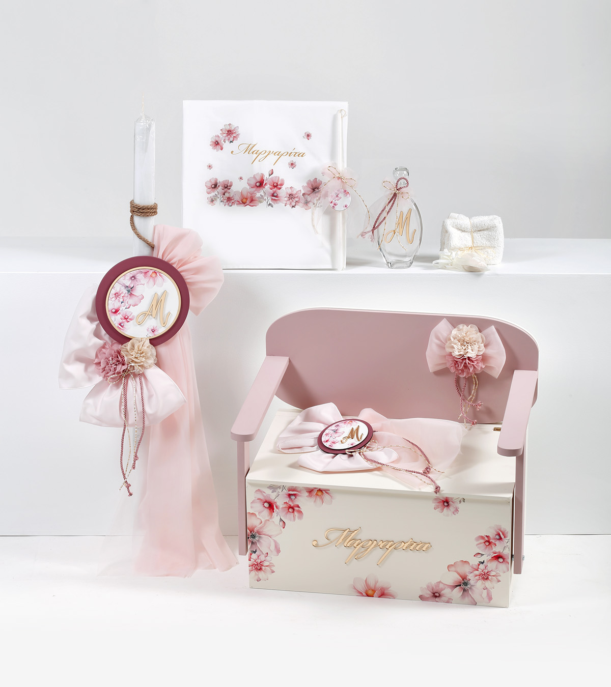 Πακέτο βάπτισης κορίτσι με θέμα Κύκλος μονόγραμμα λουλούδια μπαούλο παγκάκι