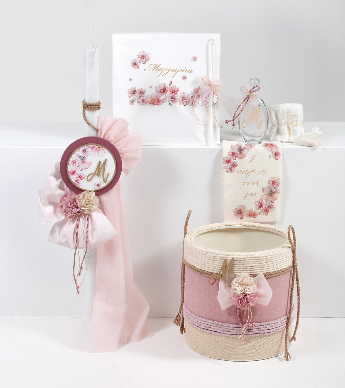 Πακέτο βάπτισης κορίτσι με θέμα Κύκλος μονόγραμμα λουλούδια στρογγυλό μπαούλο