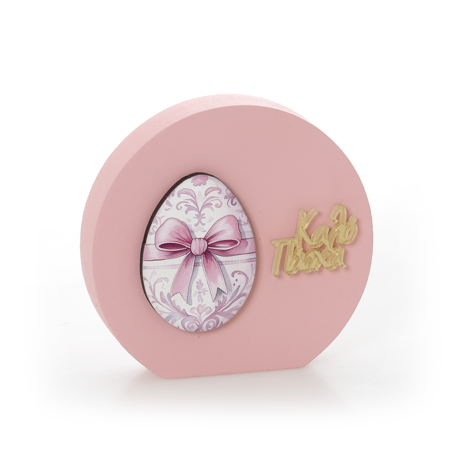 Επιτραπέζιο ξύλινο εκτυπωμένο διακοσμητικό Κύκλος τριανταφυλλί αυγό φιόγκος ροζ καλό Πάσχα