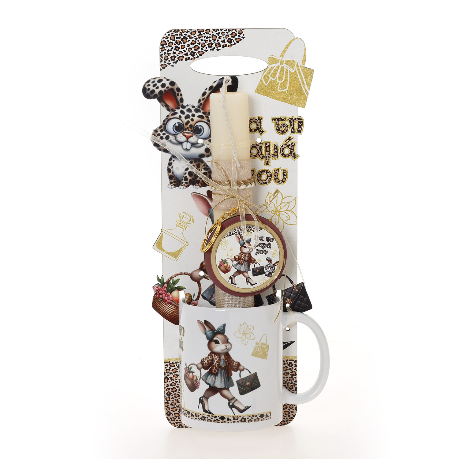 Πασχαλινή λαμπάδα με πλάτη και κούπα Λαγουδίνα λεοπάρ στη μαμά