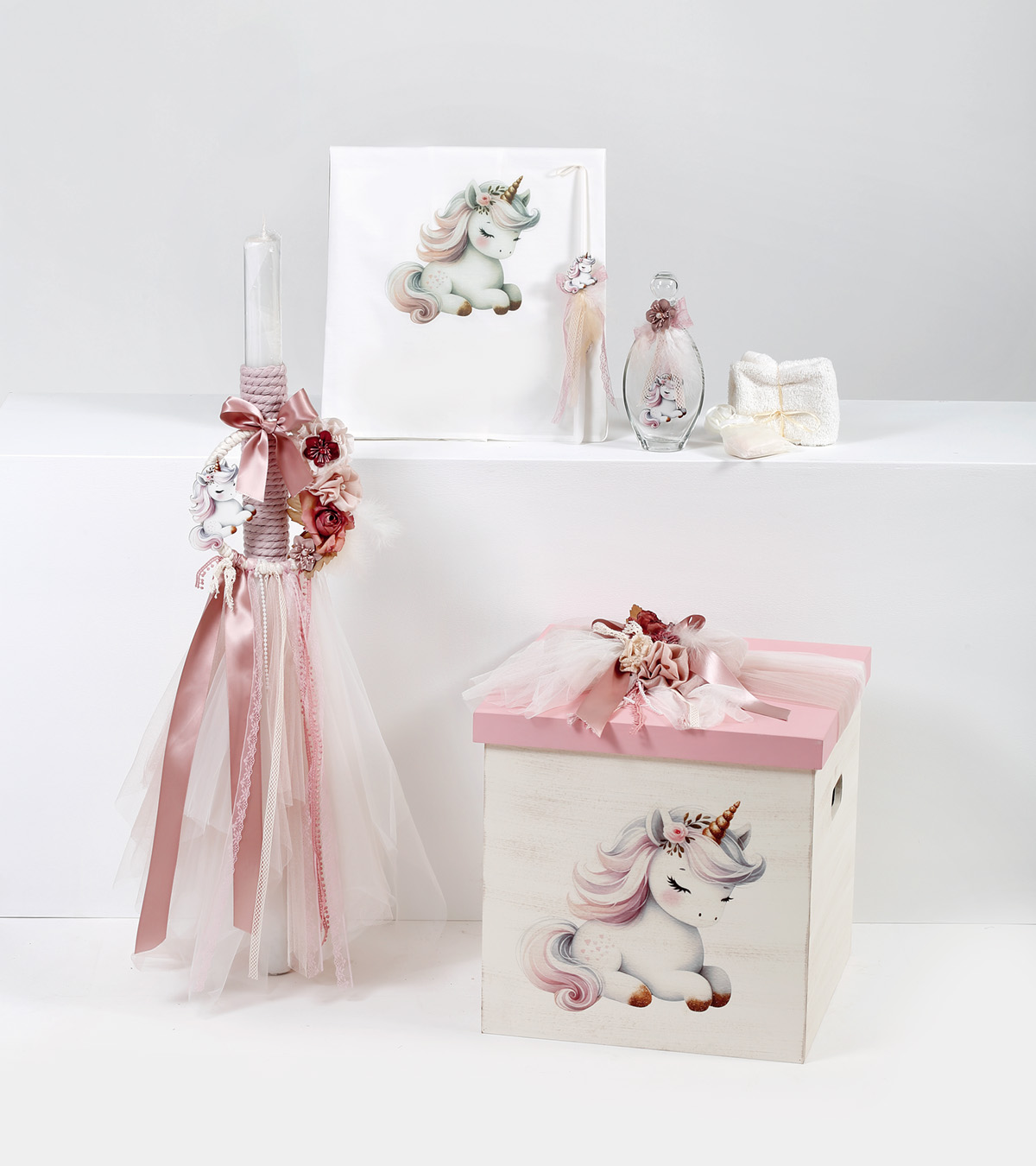 Πακέτο βάπτισης κορίτσι με θέμα Μονόκερος τετράγωνο μπαούλο