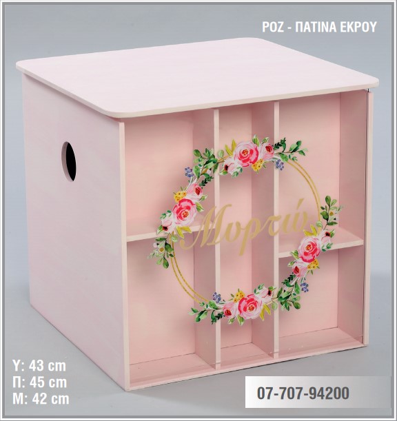Μπαούλο βάπτισης τετράγωνο με θέμα λουλουδένιο στεφάνι και όνομα