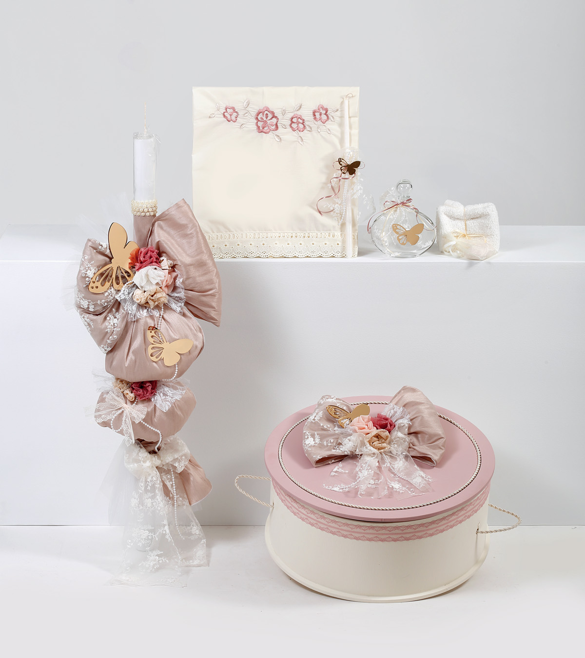 Πακέτο βάπτισης κορίτσι με θέμα Πεταλούδα μισή διατρητη φιόγκος στρογγυλό μπαούλο