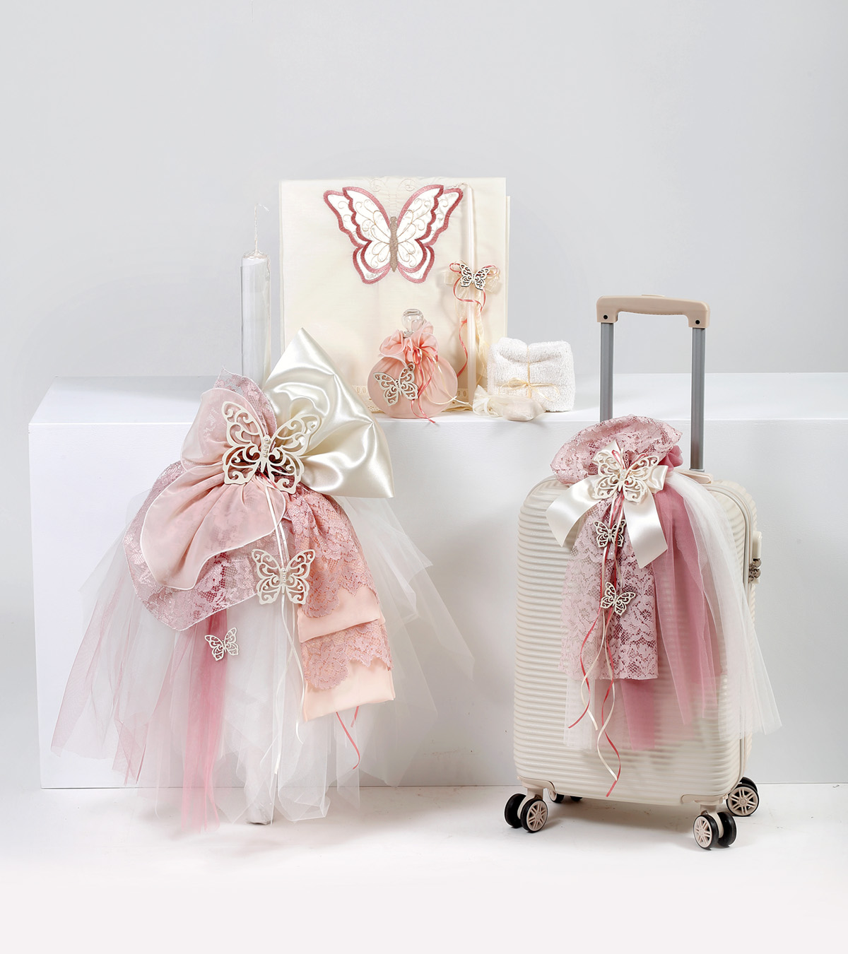Πακέτο βάπτισης κορίτσι με θέμα Πεταλούδες διάτρητες βαλίτσα