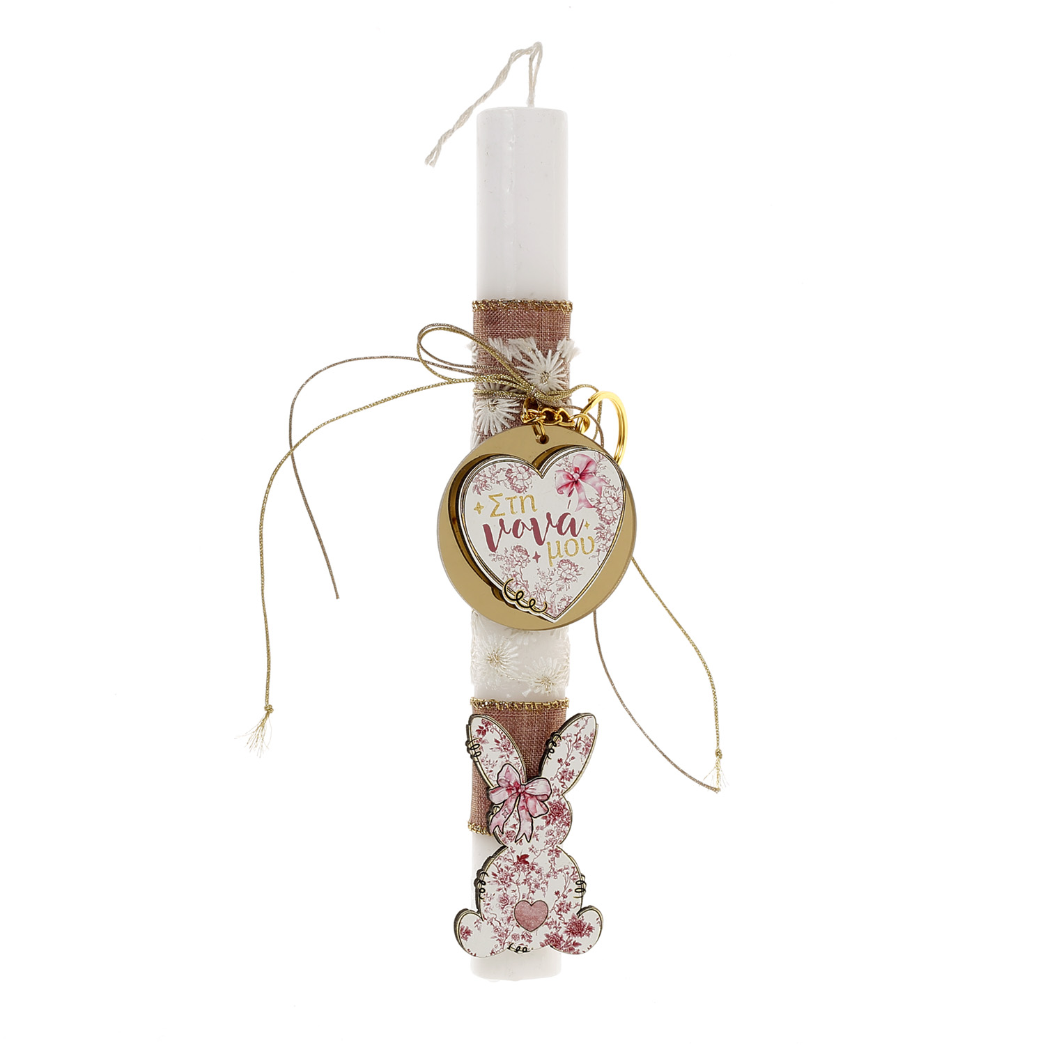Στολισμένη πασχαλινή λαμπάδα Λαγουδάκι Ροζ λουλούδια στη νονά
