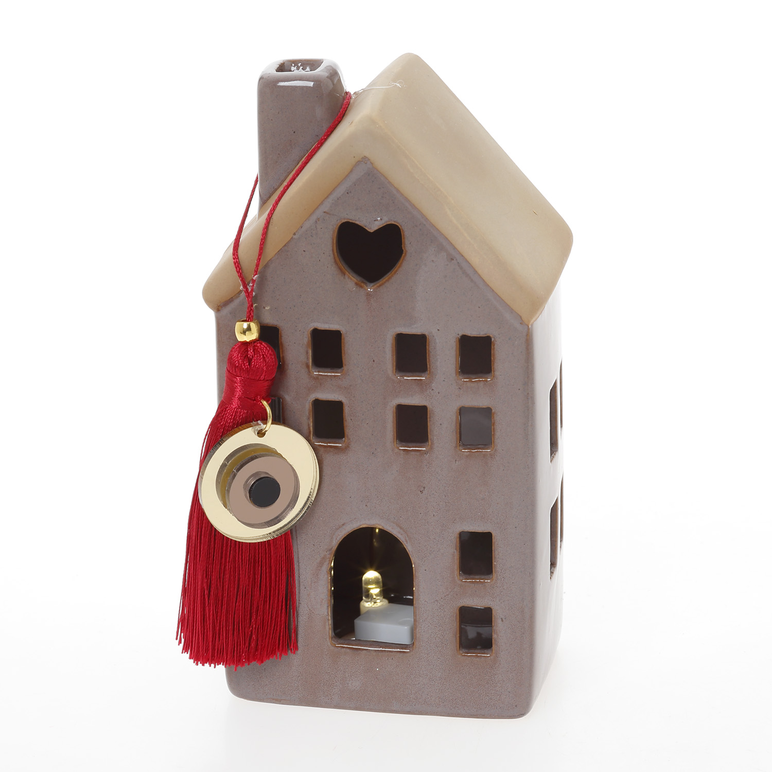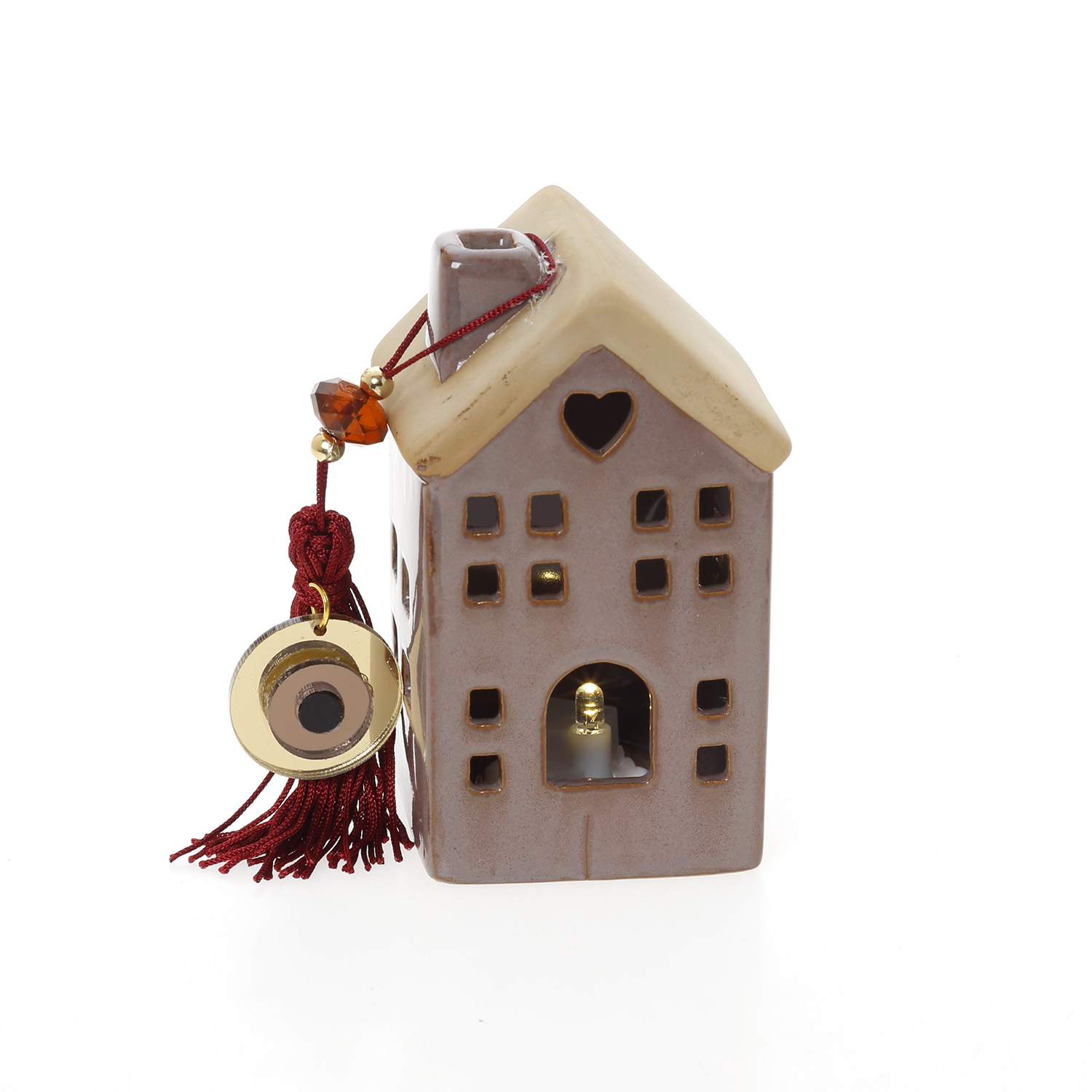 Σπίτι πορσελάνη με κόκκινη φούντα και ρόδι σε δύο διαστάσεις (10cm και 15cm)