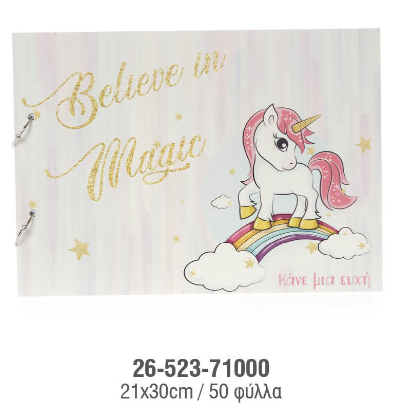 Βιβλίο ευχών βάπτισης ξύλινο με κρίκους τυπωμένο 26-523 με θέμα μονόκερο και ουράνιο τόξο