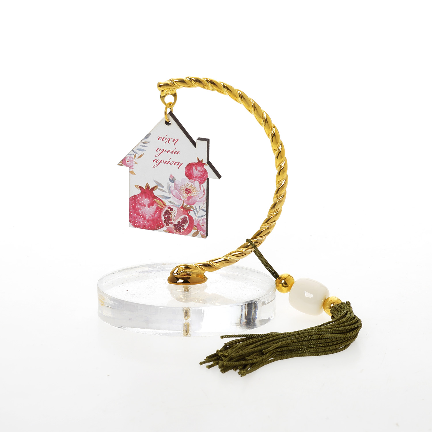 Βραχάκι οβάλ plexi σπίτι ρόδια ευχές ξύλινο τυπωμένο με λαδί φούντα