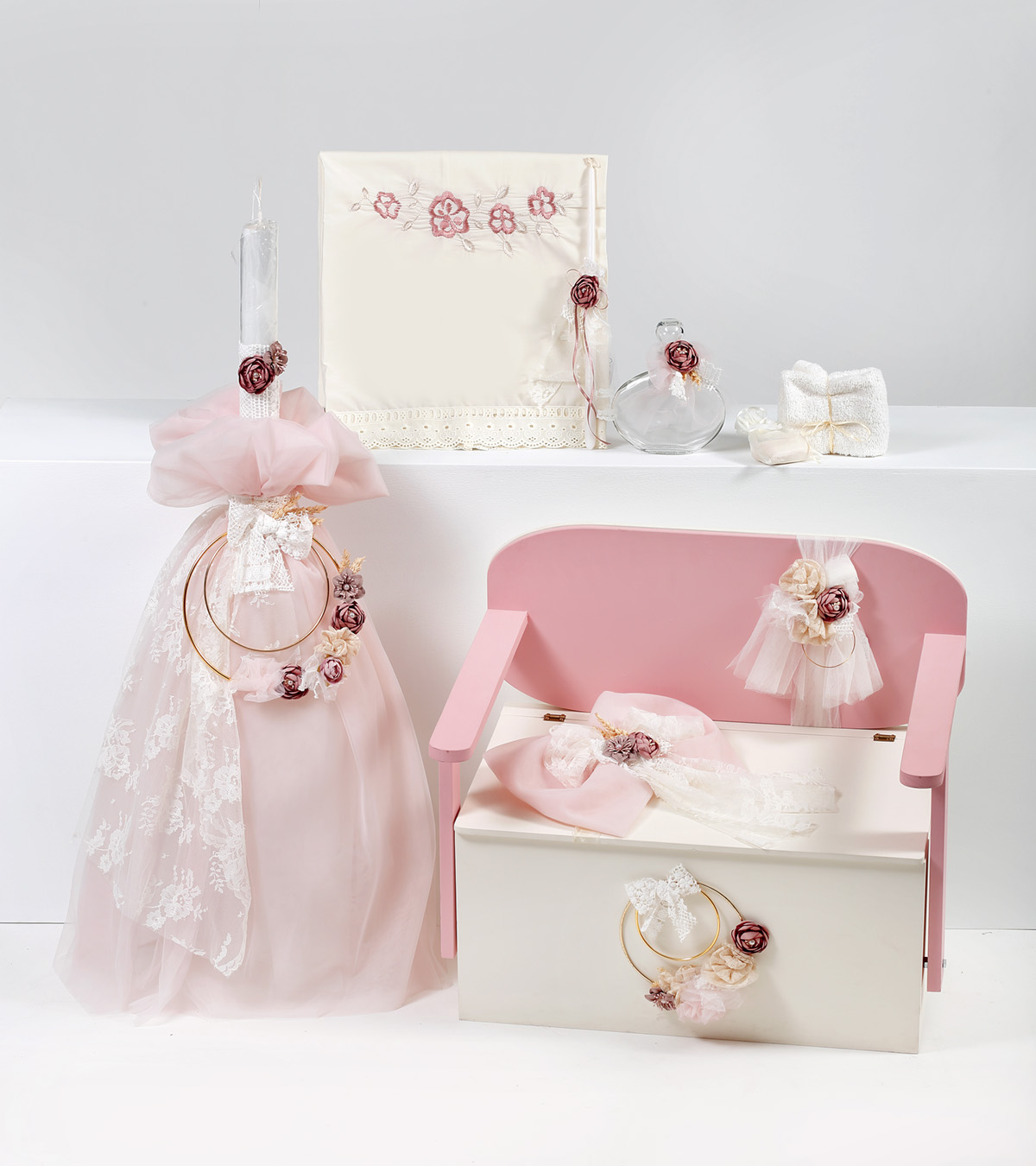 Πακέτο βάπτισης κορίτσι με θέμα Χρυσοί κύκλοι λουλούδια μπαούλο παγκάκι